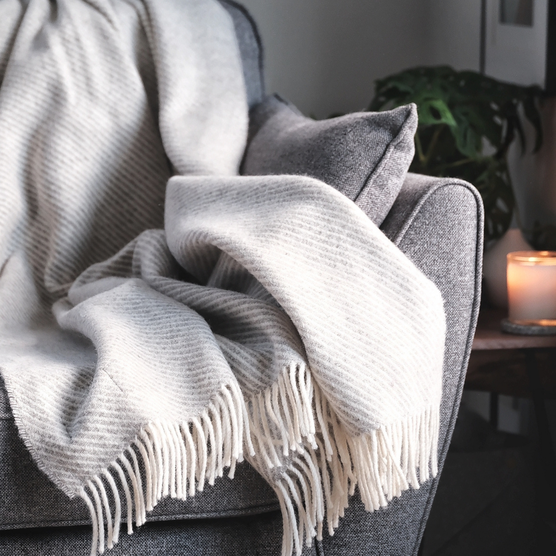 Made in Scotland by Green Grove Weavers out of 100% Jacob wool, it is a thick blanket with a stunning herringbone pattern of delicate silver grey over an ivory background. The blanket is fringed at both ends in the same ivory/cream wool.