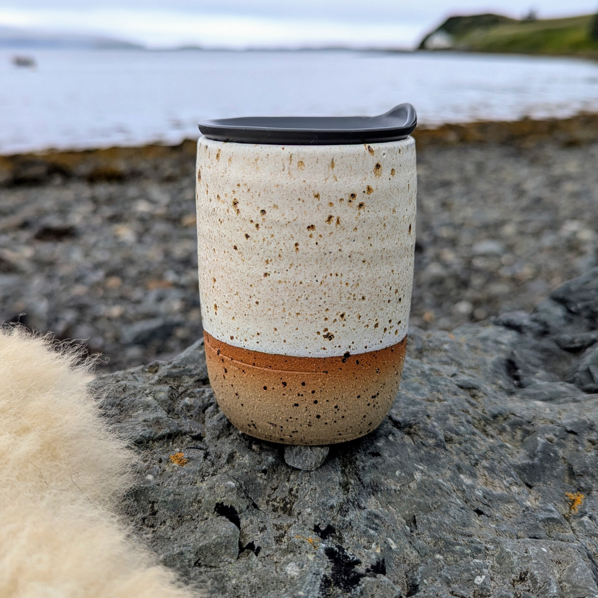 Hand thrown here in Waternish by Skio potters. Kayti and Luke, these unique travel mugs sit perfectly in your hand. Inspired by the local landscape, these beautiful and practical designs bring a sense of nature and harmony whenever - and wherever - you want to indulge in a cuppa.