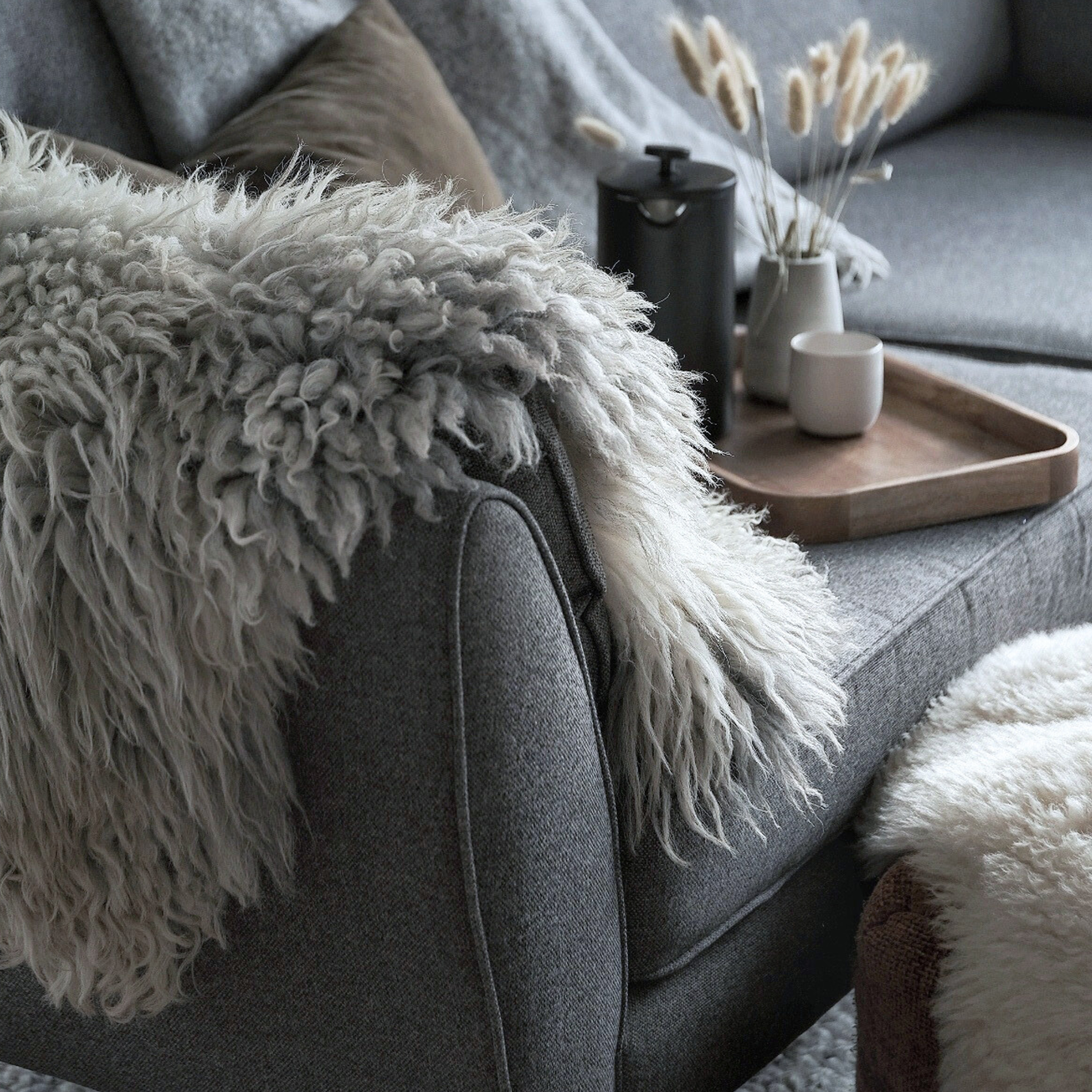 Sourced right from our family croft here on Waternish, this Hebridean crossbreed boasts a beautiful mix of whites and silvery greys. The stunning defined curls and waves of the fleece make a delightful accent draped over a chair or placed beside your bed.